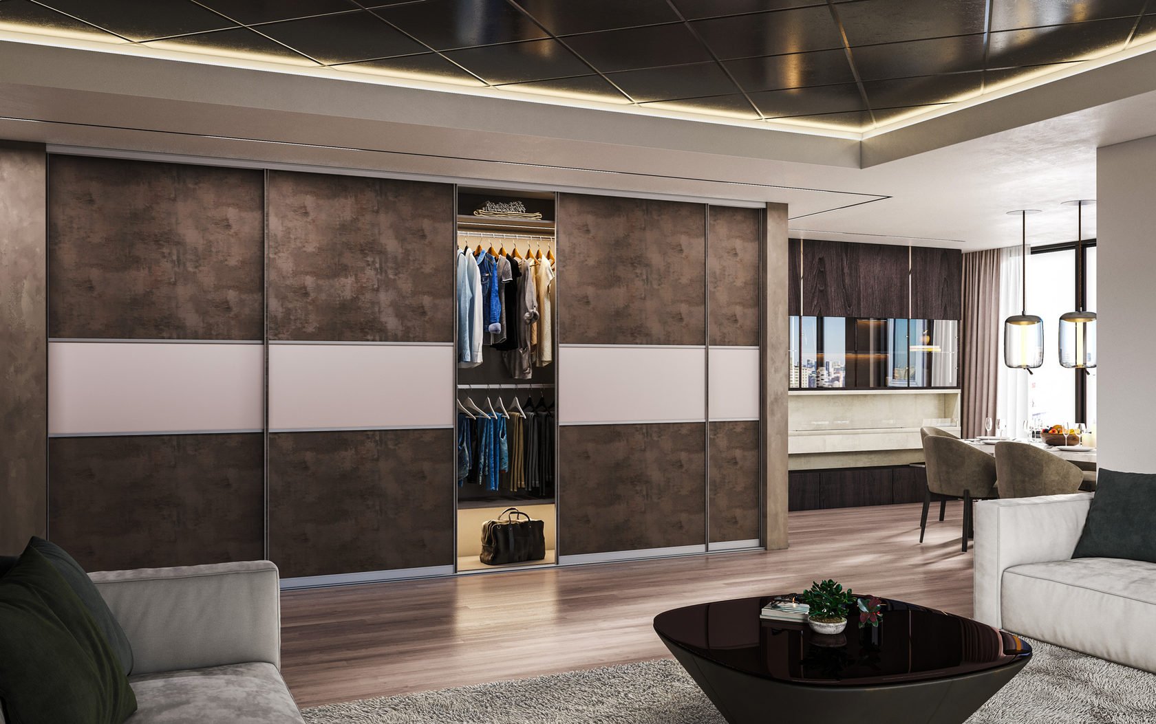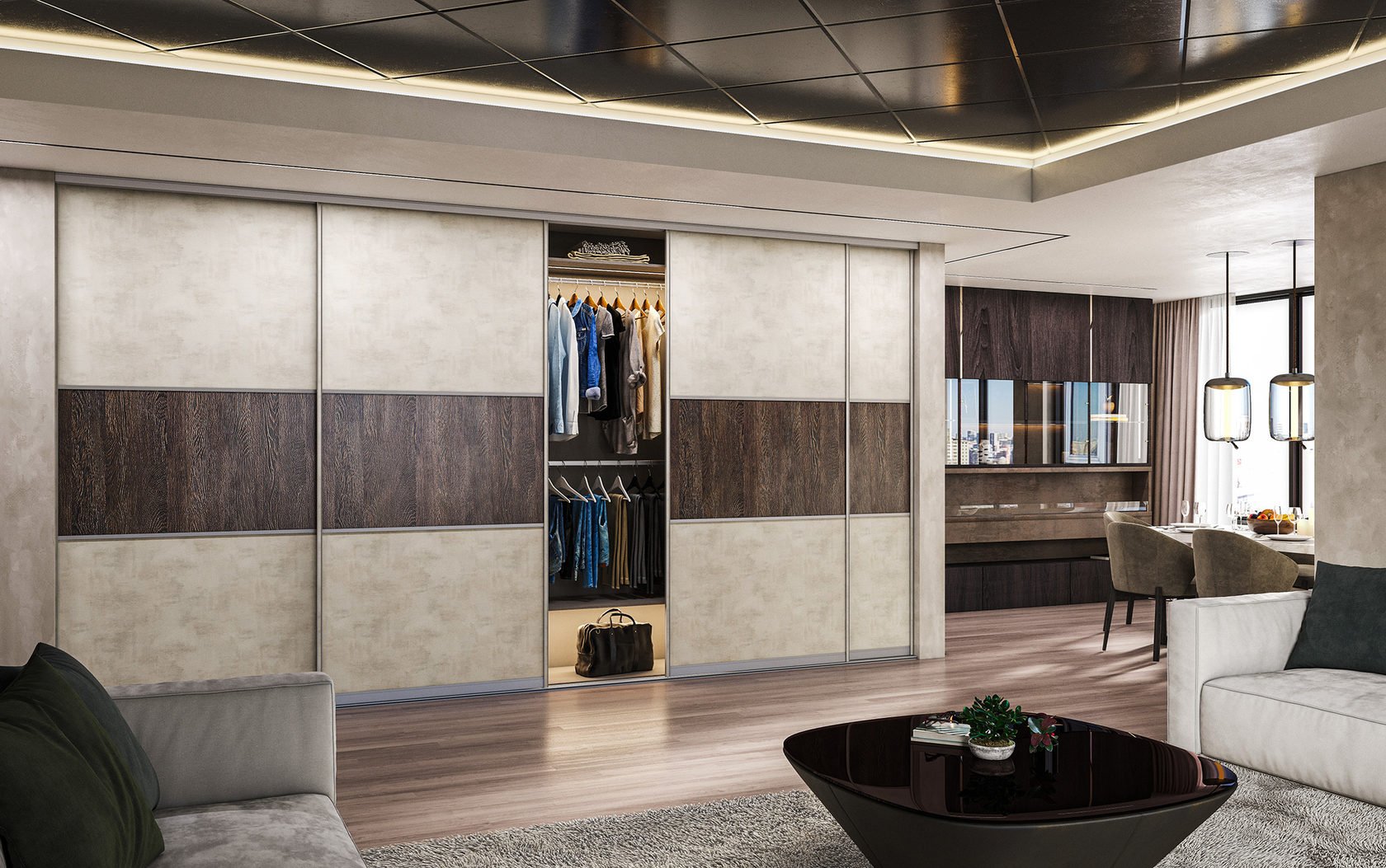 Якщо шафа-купе є центром уваги, зробіть її особливою! Доповнивши обштукатуреною поверхнею хромікса темним деревним декором ЛДСП «Венге Малі», виходить несподівано гарне і дуже виразне поєднання декорів для шафи-купе у вітальні .