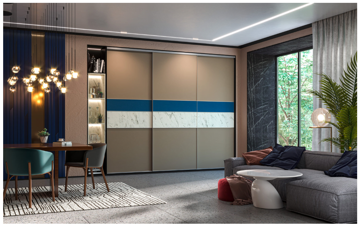 Декори, використовуються в якості вставки на нейтральному декорі матового відтінку пофарбованого скла «Hexi Горіховий». Синій відтінок у поєднанні з срібним відливом тонкої лінії алюмінієвого профілю «Геліодор» виглядає елегантно і виразно відтінює малюнок мармуру, як на вставці, так і на вбудованих полицях у шафи-купе.