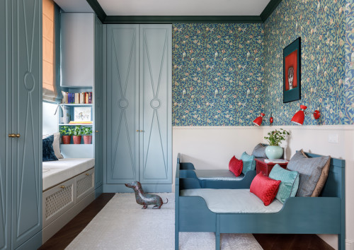 Проще всего симметрии парным комплектом мебели, но это не обязательно. Можно также работать с предметами схожих форм или рацветок.