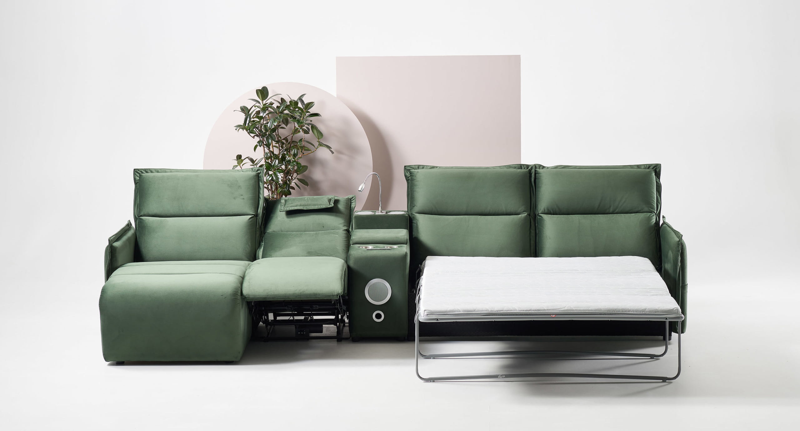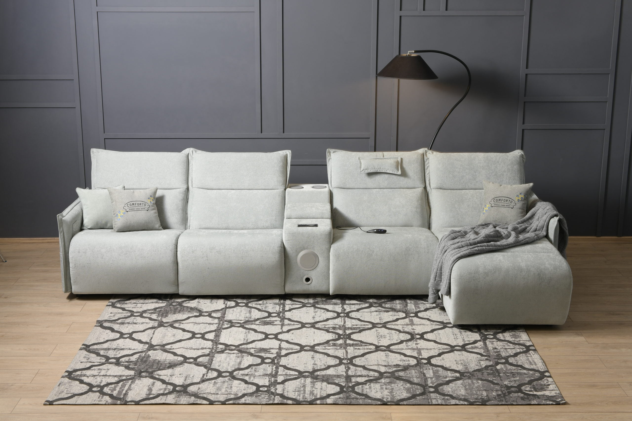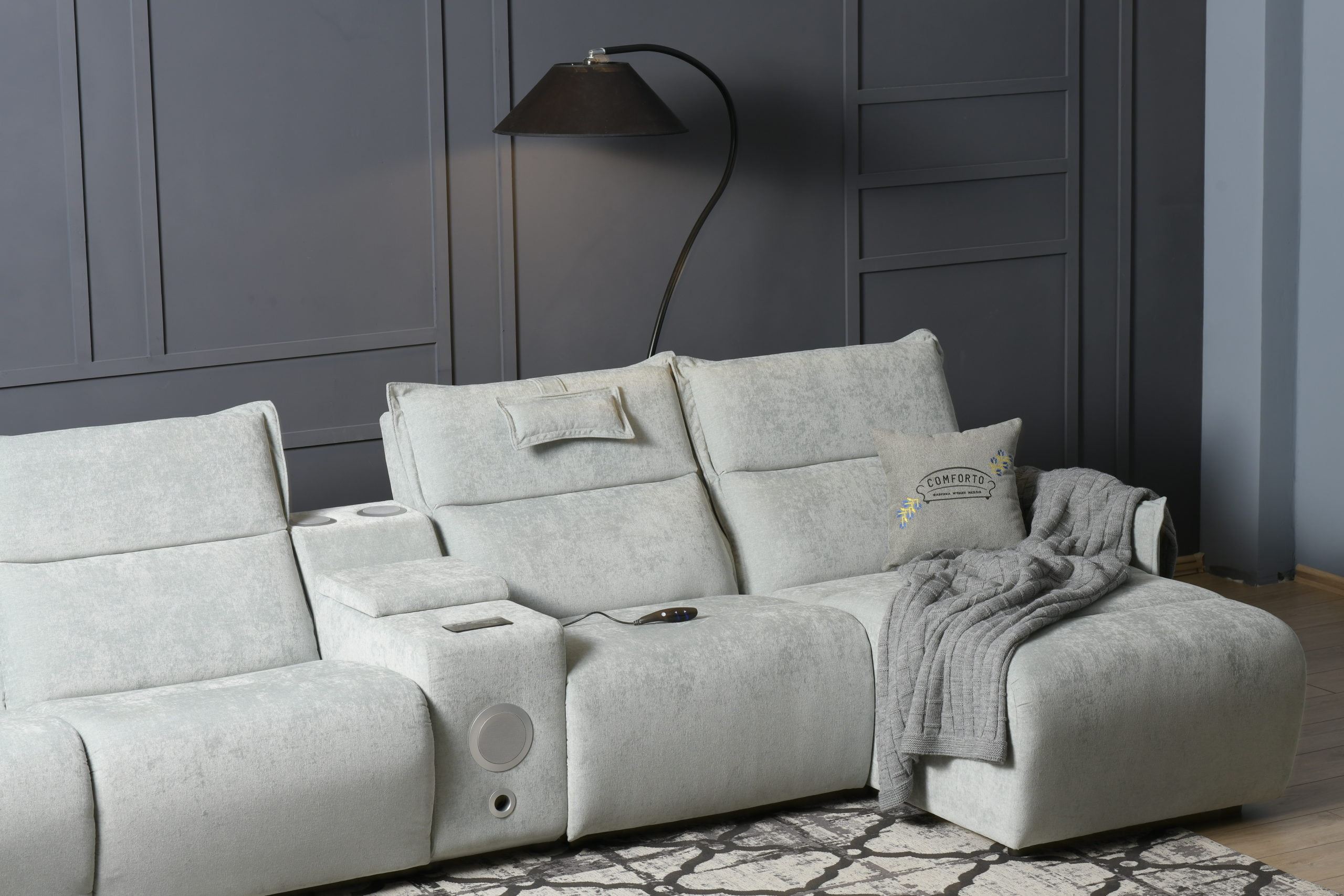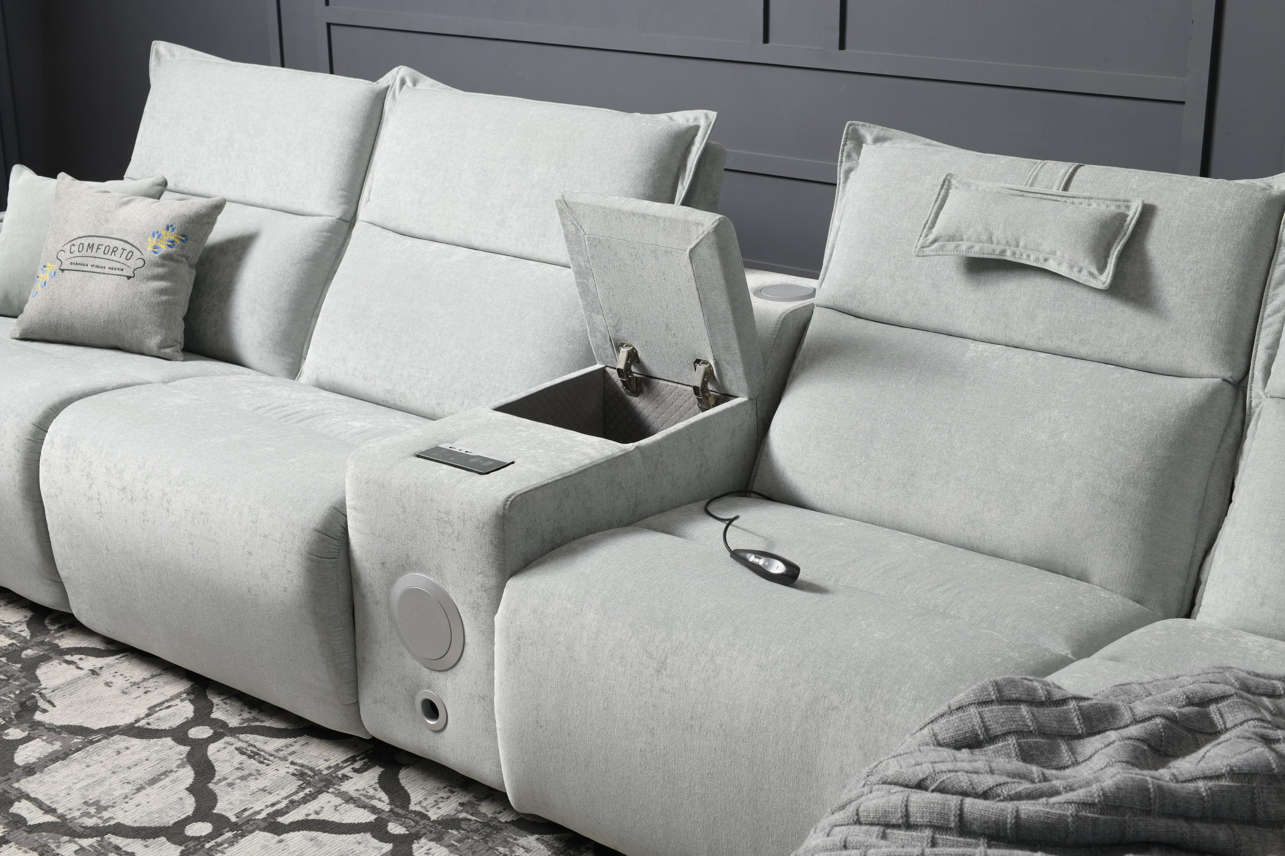 Такі додаткові функції як підзарядка для телефону, реклайнери, ніша для зберігання підсилюють комфорт цього дивану. Цей диван є модульним, а отже він є функціональним. Ви можете адаптувати його до вашого власного стилю життя та потреб, змінюючи конфігурацію та розміщення частин.