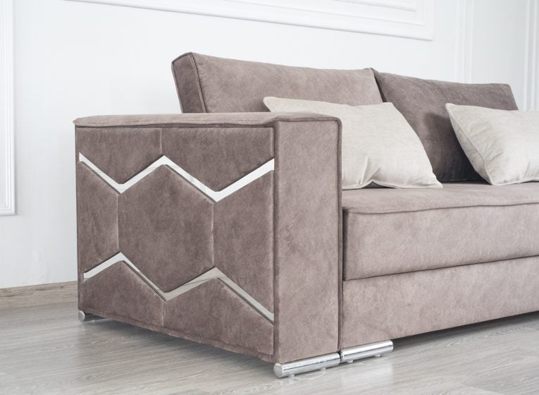Сріблясті ніжки дивану не лише створюють візуальний акцент, але і надають легкості та грації. Підлокітники дивану прикрашені сріблястими вставками, які привертають увагу і додають додатковий елемент розкоші. Окрім естетичного дизайну, цей диван також є практичним завдяки спальному місцю. Механізм трансформації дозволяє легко перетворити диван на зручне ліжко, що робить його ідеальним вибором для тих, хто шукає комфорт і практичність в одному виробі.