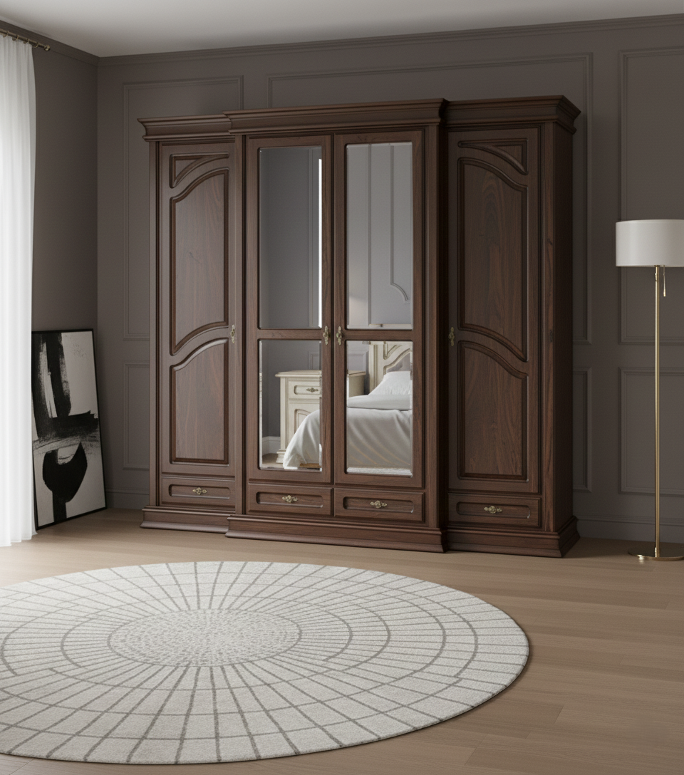 Шафа має чотири двері з дзеркальними фасадами та декором у вигляді різьблених накладок, що підсилює візуальний ефект і створює відчуття витонченості й розкоші. Виготовлення з масиву дерева та дубового шпону гарантує високу міцність конструкції та тривалий термін служби, а також природну текстуру та красивий зовнішній вигляд, що гармонійно вписується у класичний або transitional інтер’єр.