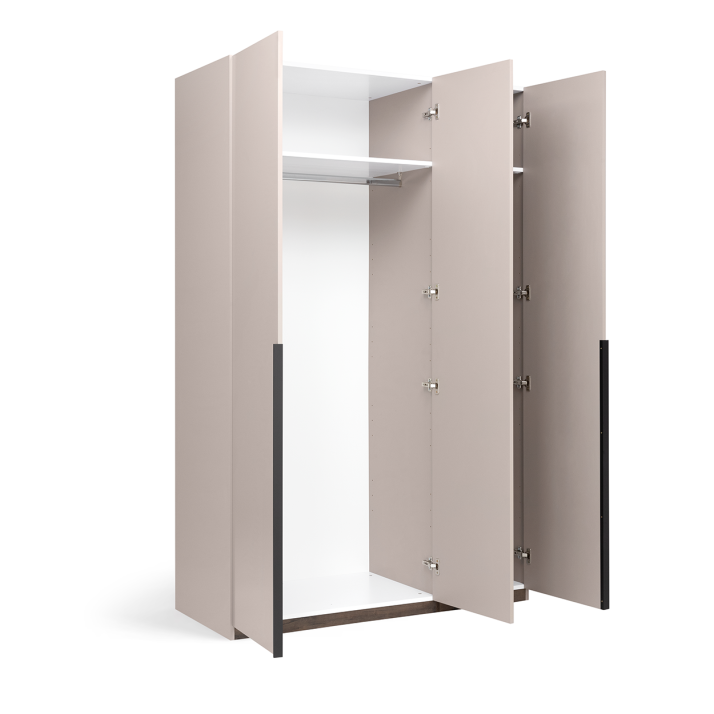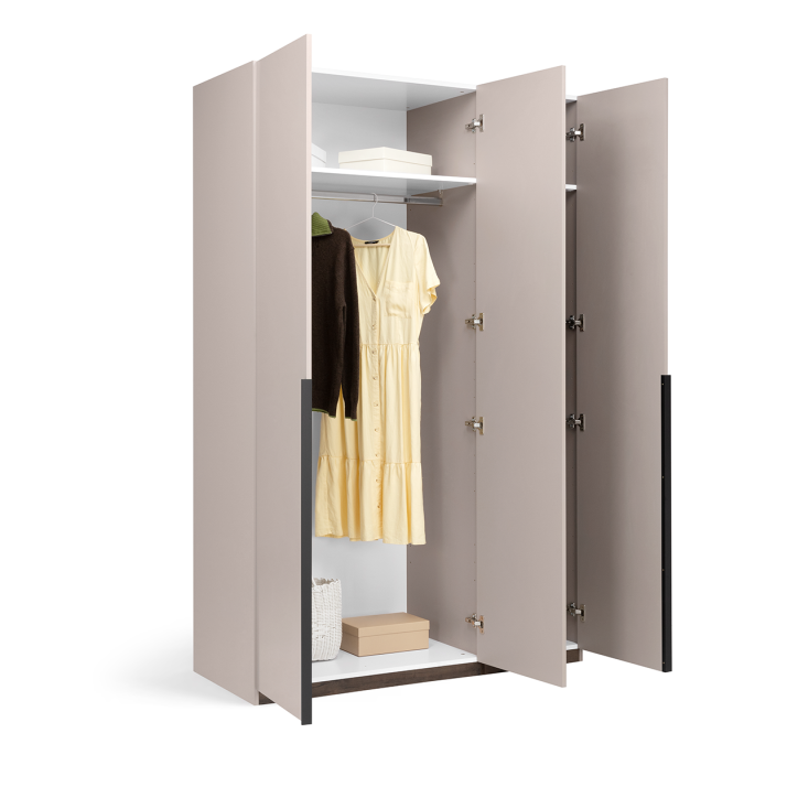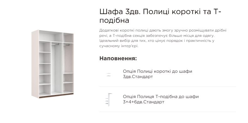 Ця трьохдверна шафа має достатньо місця для зберігання великої кількості одягу, взуття, білизни та аксесуарів. Внутрішній простір продуманий так, щоб забезпечити зручність та організованість: полички, штанги для плечиків та відділення для коробок чи сезонних речей. Практичні двері легко відкриваються й щільно закриваються, забезпечуючи надійний захист вмісту.