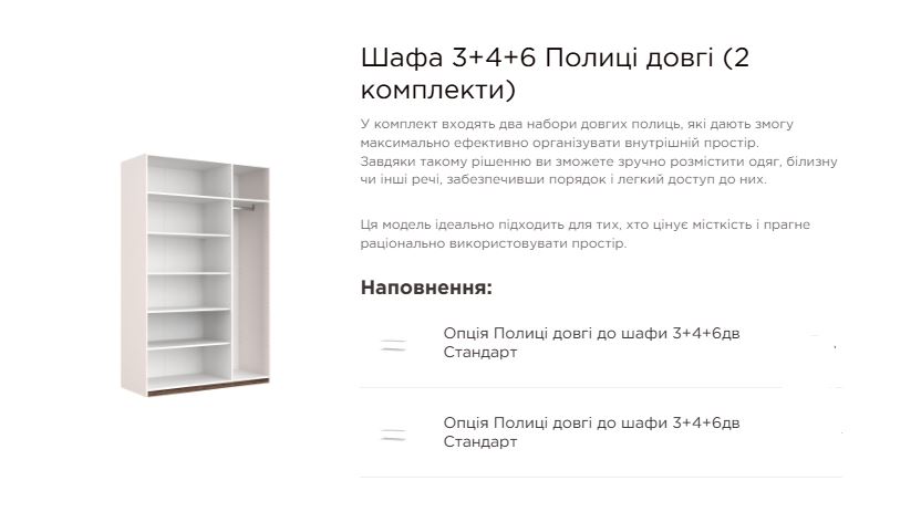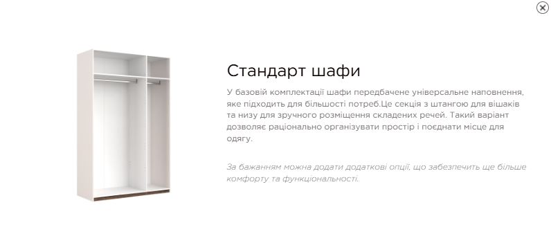 Внутрішнє наповнення: штанги для плечиків, полички для зберігання
