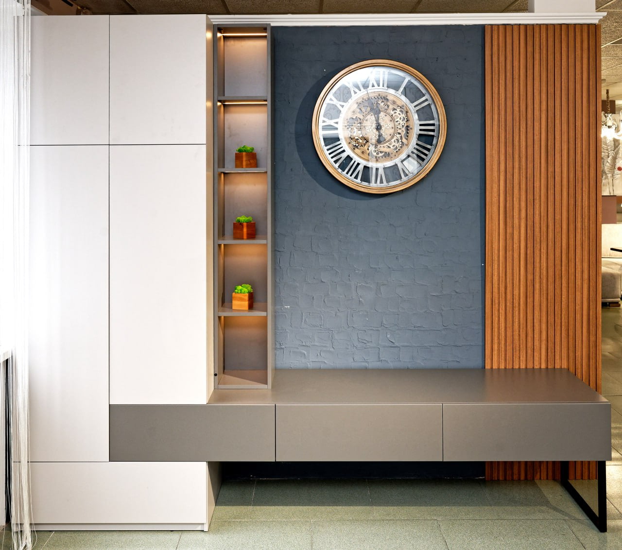 Вітальня Злато – це наш перший авторський проєкт власного виробництва, який ми з гордістю презентуємо клієнтам. Вітальня була виготовлена за останніми тенденціями у світі меблевих інтер’єрів. Вона складається із тумби для телевізора, шафи для зберігання речей та дерев’яних рейок. Вітальня виконана у нейтральному сіро-білому кольорі, завдяки чому вона ідеально впишеться у будь-яке помешкання. Дерев’яні рейки натурального відтінку додають їй тепла та затишності. Окрім естетичного зовнішнього вигляду вітальня Злато є якісною, адже виготовлена з якісного ЛДСП.